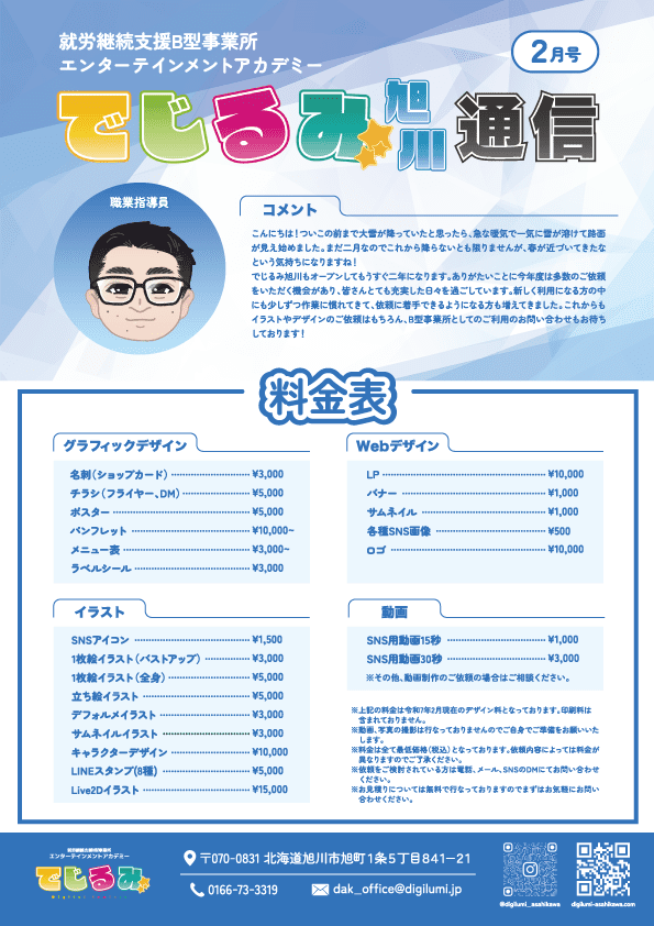 でじるみ旭川では、見学・体験希望のお問い合わせはもちろん、 イラストやデザインのご依頼も承っておりますので、気になりましたらぜひお問い合わせください。